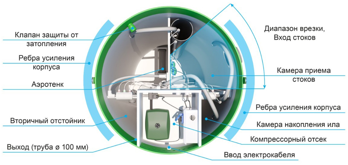 Распределительно-регулировочный узел размещён на внешней стороне стенки камеры с компрессорами. Из него идут воздуховоды к каждому потребителю станции автономной канализации.